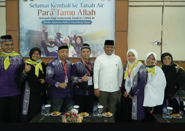 Bupati Pelalawan, H. Zukri, menyambut langsung kedatangan jamaah haji asal Kabupaten Pelalawan dan Kabupaten Indragiri Hulu (Inhu) yang tiba di Asrama Haji.