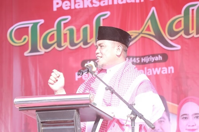 Bupati Pelalawan H. Zukri SE menyampaikan sambutan pada saat pelaksanaan sholat Idul Adha 1445 Hijriah di halaman kantor camat Pangkalan.