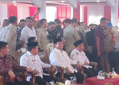 Menteri Pertahanan RI Prabowo Subianto tiba di Rakernas Asosiasi Pemerintah Desa Seluruh Indonesia (Apdesi) 2023, Rabu (26/7/2023)..