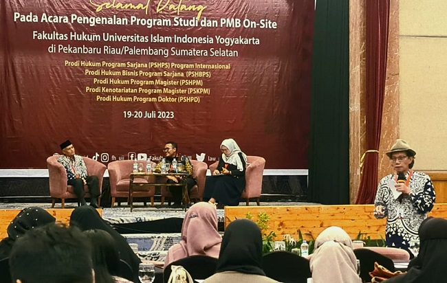 PEKANBARU - Bersempena dengan 1 Muharram 1445H, Pimpinan Fakultas Hukum Universitas Islam Indonesia (UII) Yogyakarta mengambil terobosan baru: Sosialisasi Penerimaan Mahasiswa Baru (PMB) Tahun Ajaran 2023-2024. Sosialisasi PMB berlangsung di Hotel Arya Duta Pekanbaru pada Rabu (19/7 2023) sejak pukul 09.30 - 17.00 wib untuk program strata satu, strata dua dan strata tiga. Menurut Wakil Dekan Bidang Keagamaan, Kemahasiswaan dan Alumni Drs Agus Triyanta MA MH Ph.D, kegiatan ini merupakan tindak lanjut dari penanda-tanganan Memory of Understanding (MoU) antara Rektor UII Prof Fathul Wahid dengan Gubernur Riau Drs H Syamsuar, akhir Mei 2023.